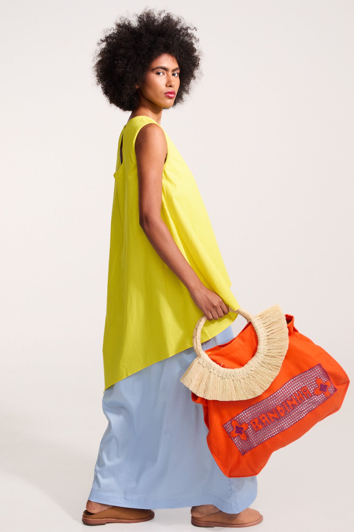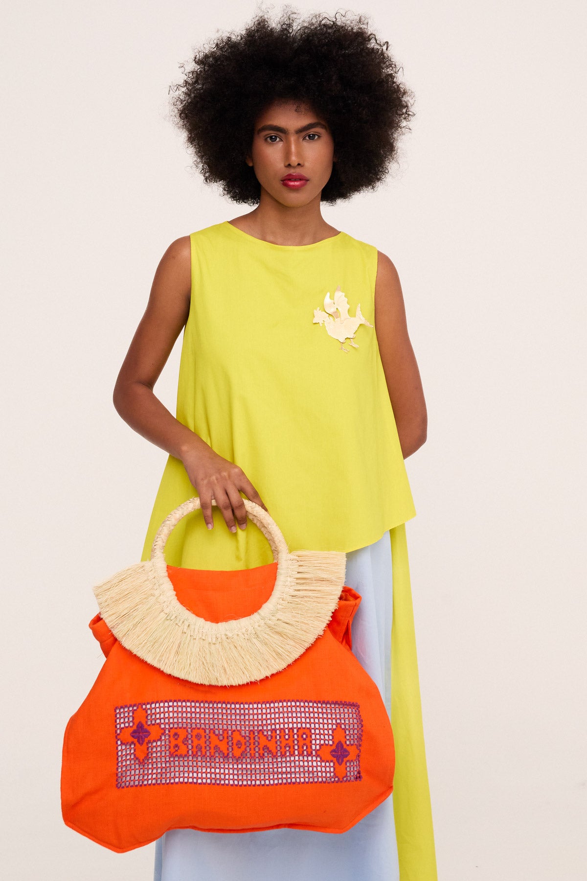 Bolsa em tecido com forro e bolso interno chapado. Recebe alças de palha de ouricuri desenvolvidas em parceria com o grupo produtivo Pontal Art em Pontal do Coruripe - AL além de carregar bordado desenvolvido por Miguel Correia, artesão do povoado de Entremontes - AL com nomes dos pontos que compreendem a técnica do bordado redendê