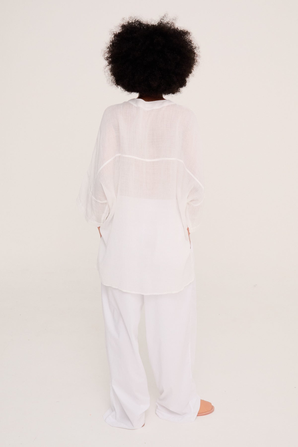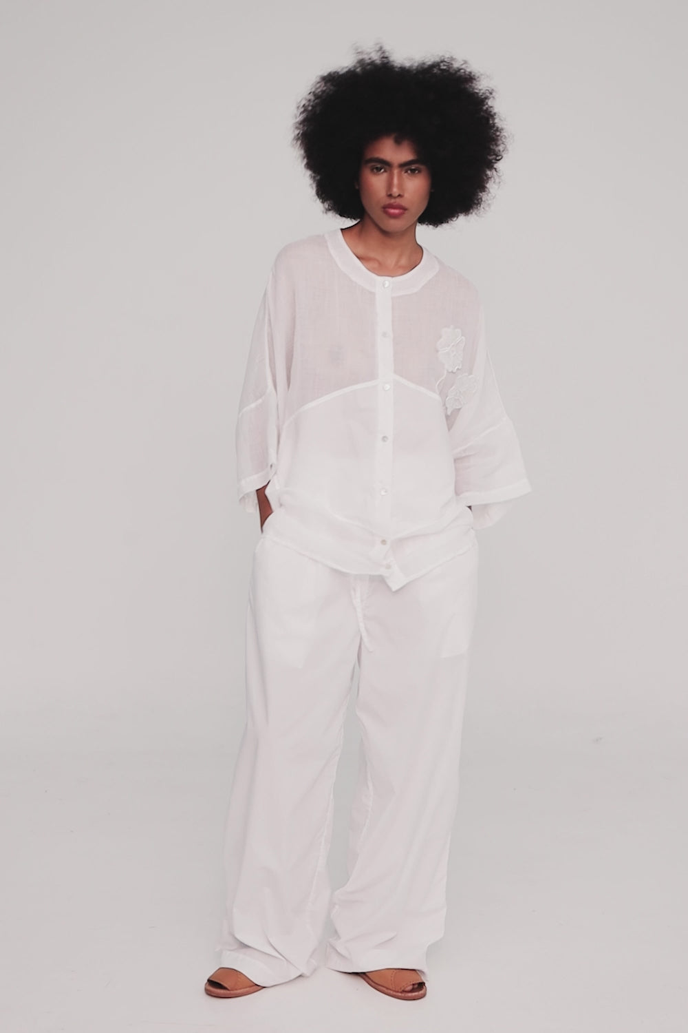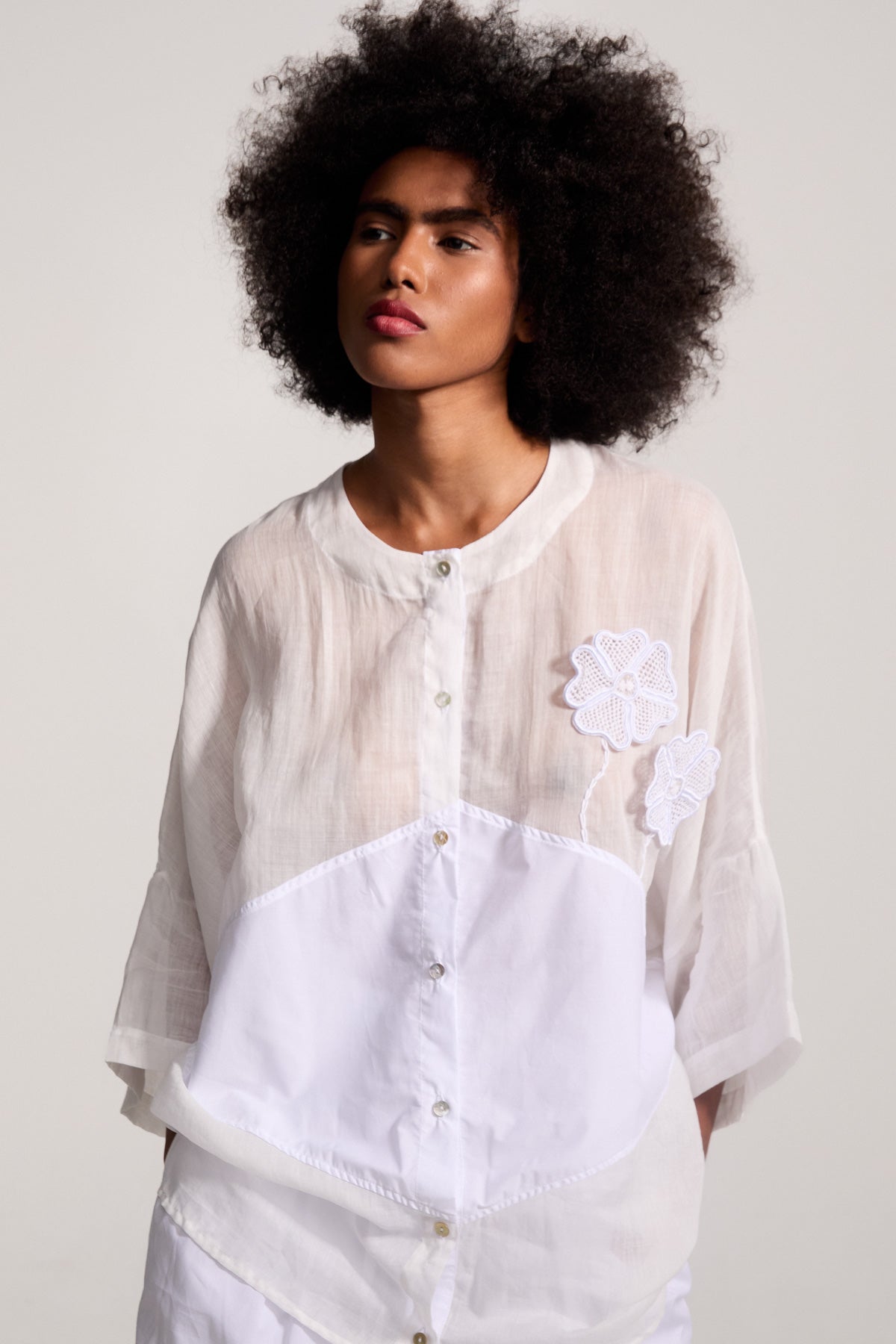 Camisa confeccionada em tricoline de algodão premium com acabamento levemente acetinado e recorte em formato de losango na parte frontal em organi de rami, tecido com leve transparência. A peça possui gola careca com acabendo interno em revel de mesmo tecido e costuras internas em técnica de acabamento inglês. Vista simples com caseado e botões em madrepérola. Recebe aplicação de flores em renda irlandesa, técnica artesanal típica do estado de Sergipe, confeccionada pelo grupo produtivo ASDREN em Divina Patora, interior do estado. A aplicação de renda vem acomapanhada de bordado em ponto corrente em linha de meada 100% algodão desenvolvido em nosso ateliê em São Paulo.