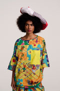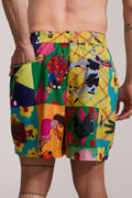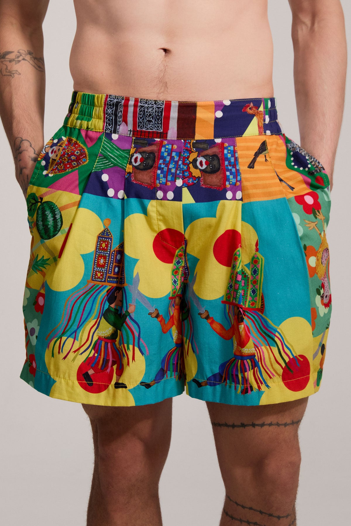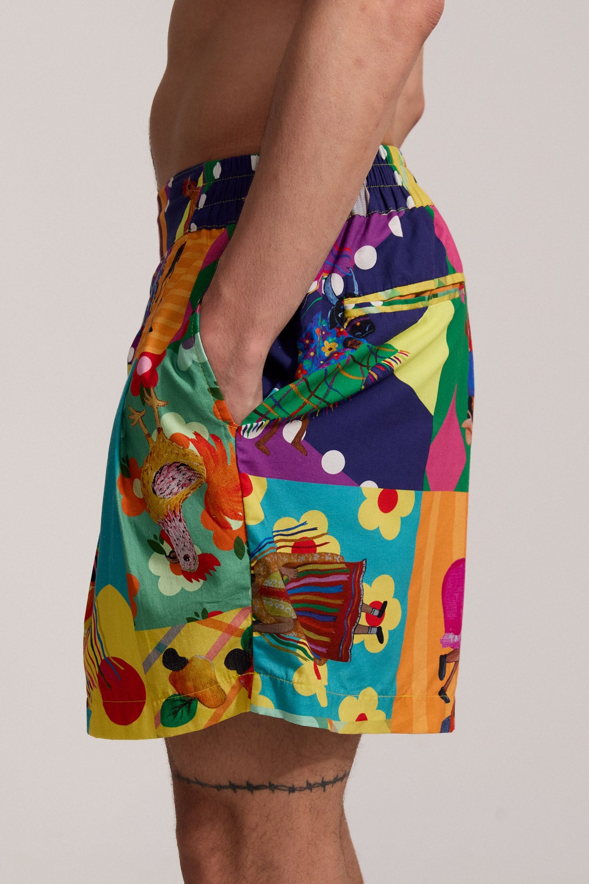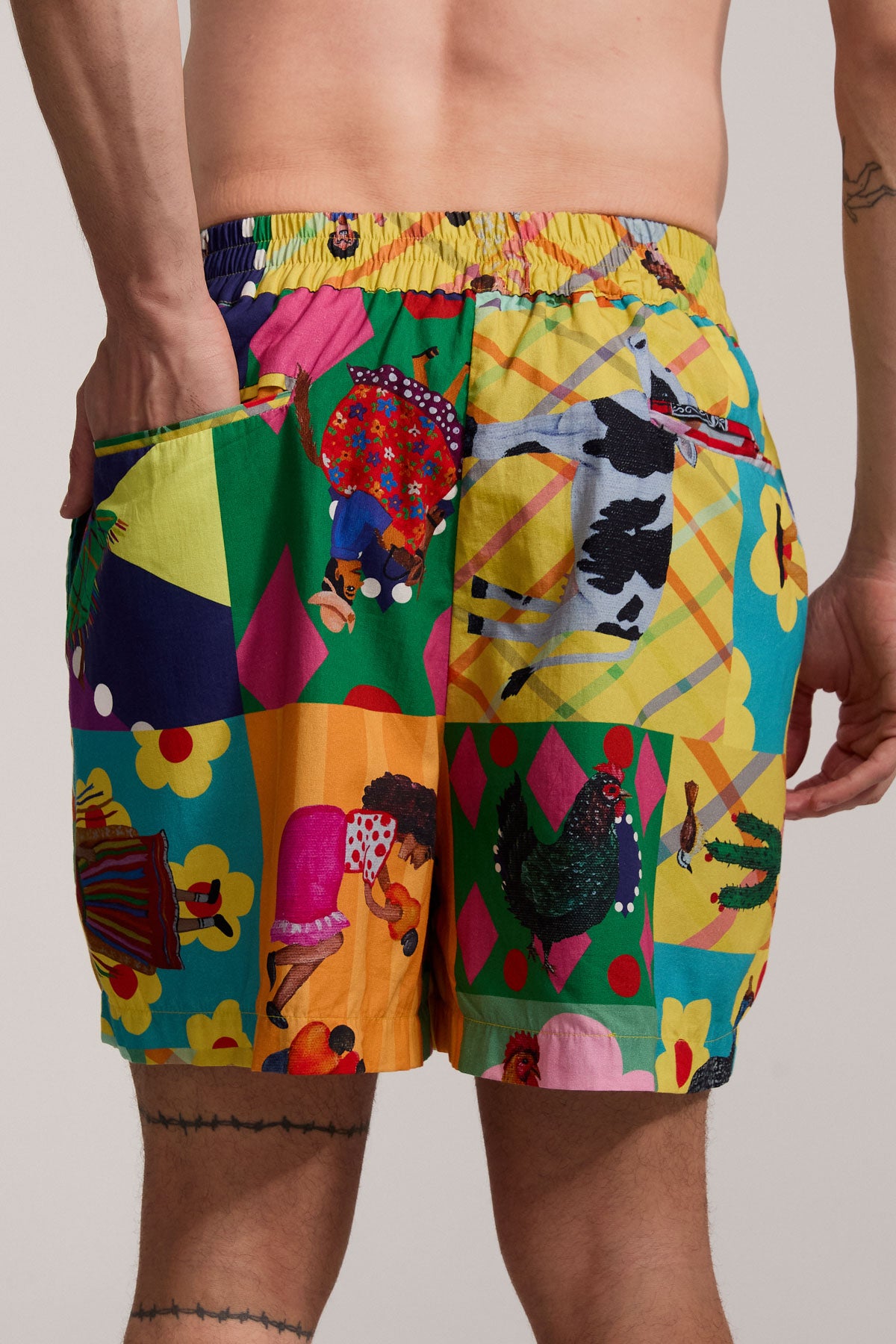 Short em tricoline de algodão premium. Possui elástico na parte traseira do cós que se estente até a altura das pences frontais onde se torna cós fixo. Prega dupla na altura das pences em ambos os lados da parte frontal e braguilha falsa pespontada. Bolsos faca nas laterais e bolsos com vivo duplo na parte traseira. Estampa exclusiva desenvolvida para a coleção Povoado Poesia a partir de pinturas criadas por Luciana Almeida, artista e bordadeira de Capela - AL
