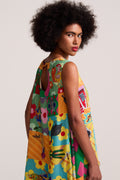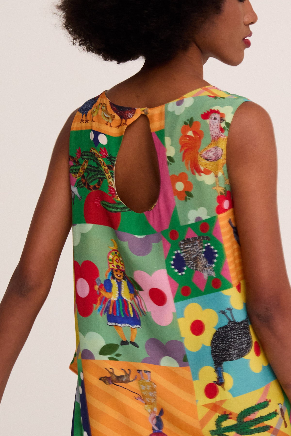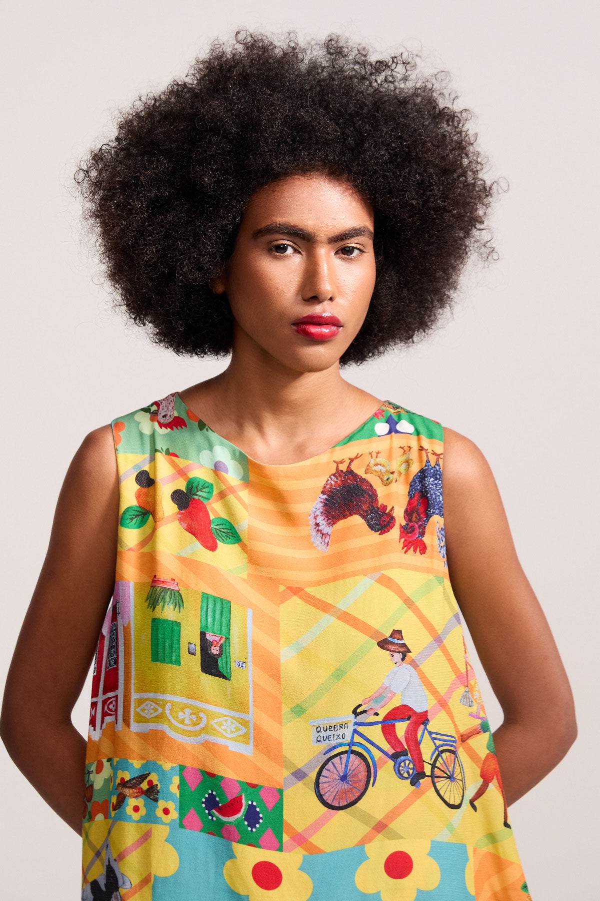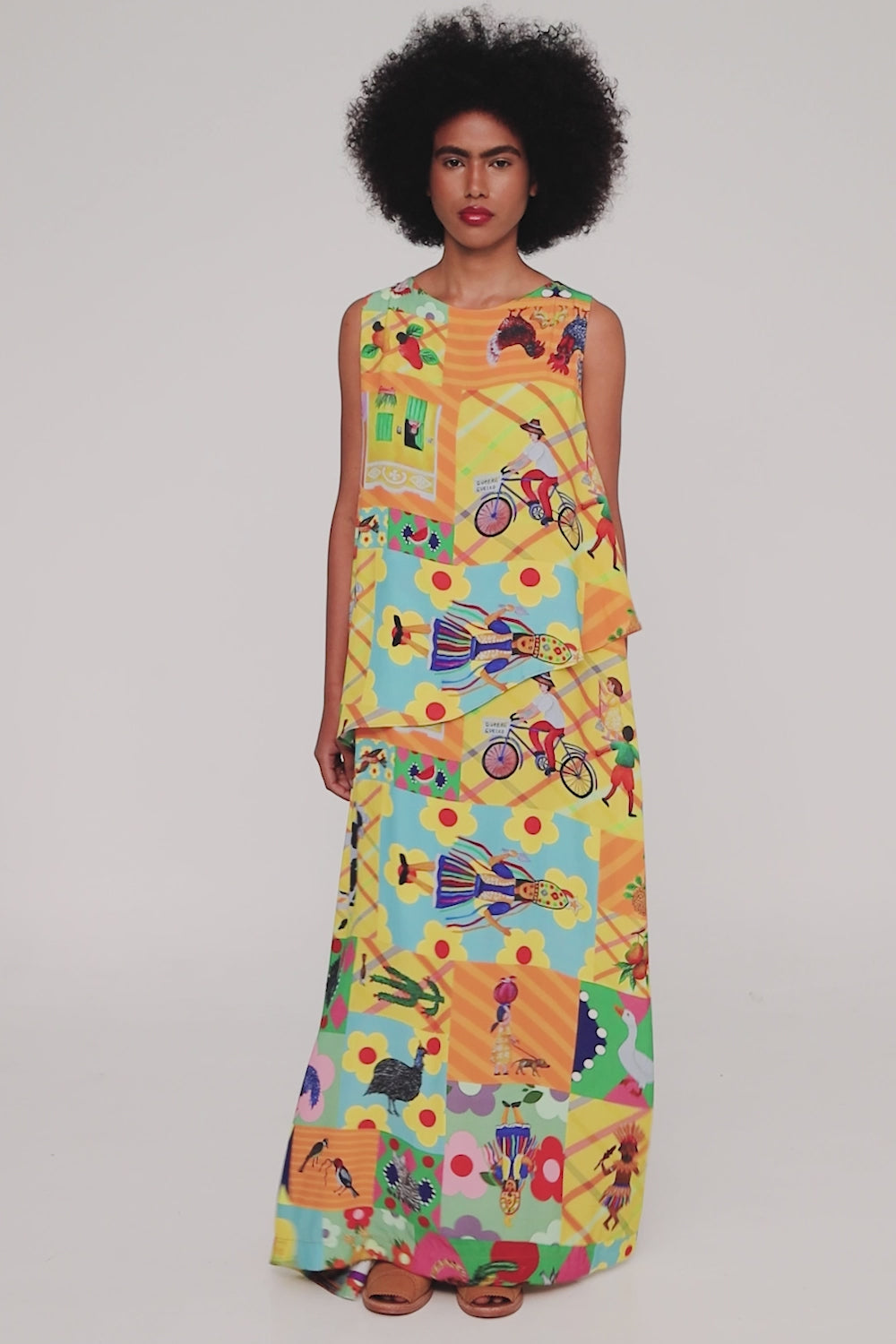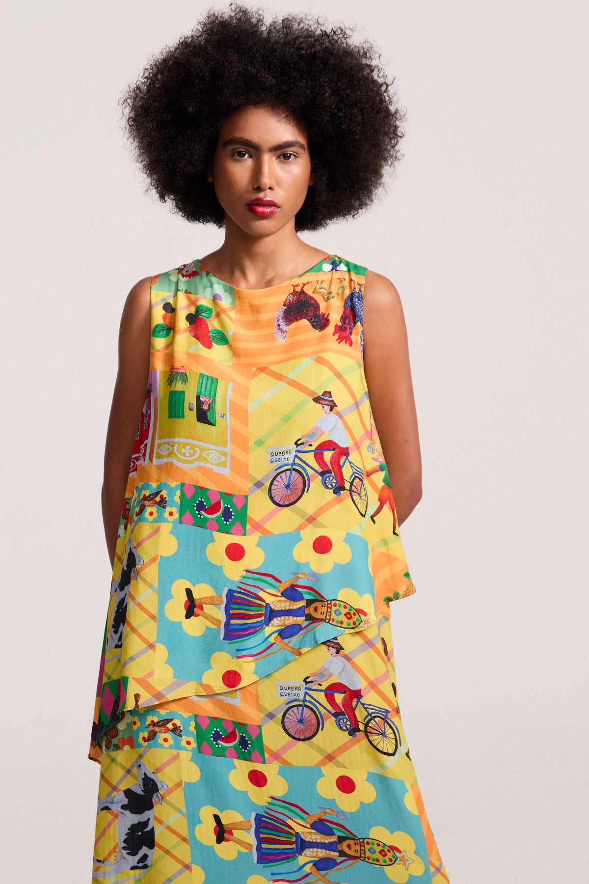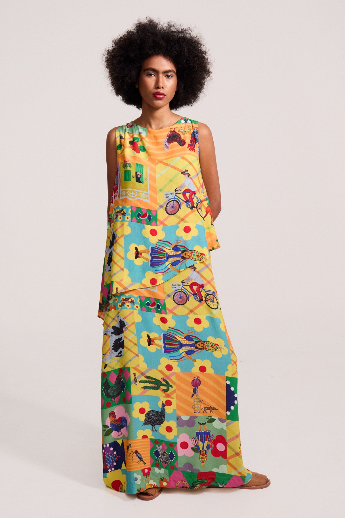 Vestido em tricoline de algodão premium com acabamento levemente acetinado. Decote canoa com fechamento em abertura "gota" na parte traseira e abotoamento em botão único de madrepérola. Possui sobrecamada em espiral que contorna o corpo. Comprimento longo e formato evasê em A. Estampa exclusiva desenvolvida para a coleção Povoado Poesia a partir de pinturas criadas por Luciana Almeida, artista e bordadeira de Capela - AL