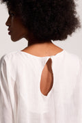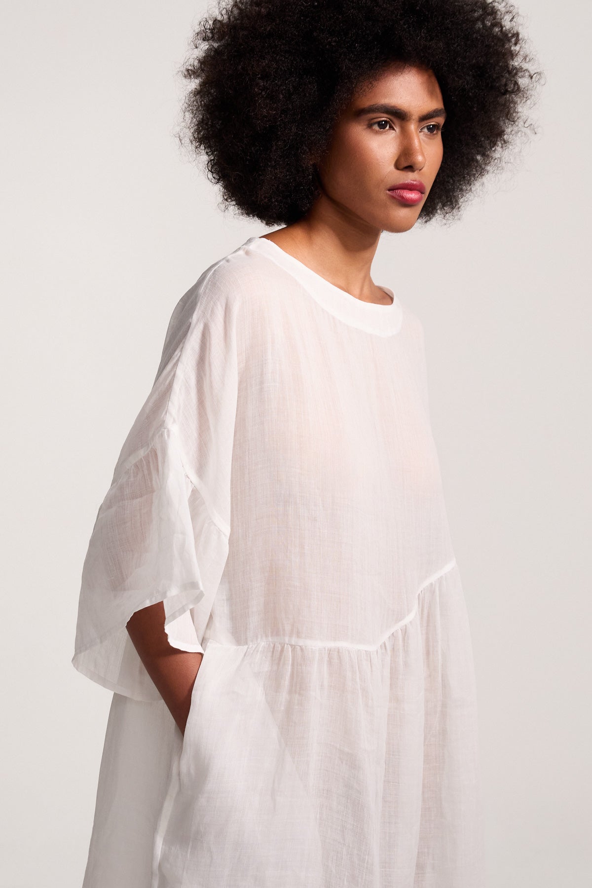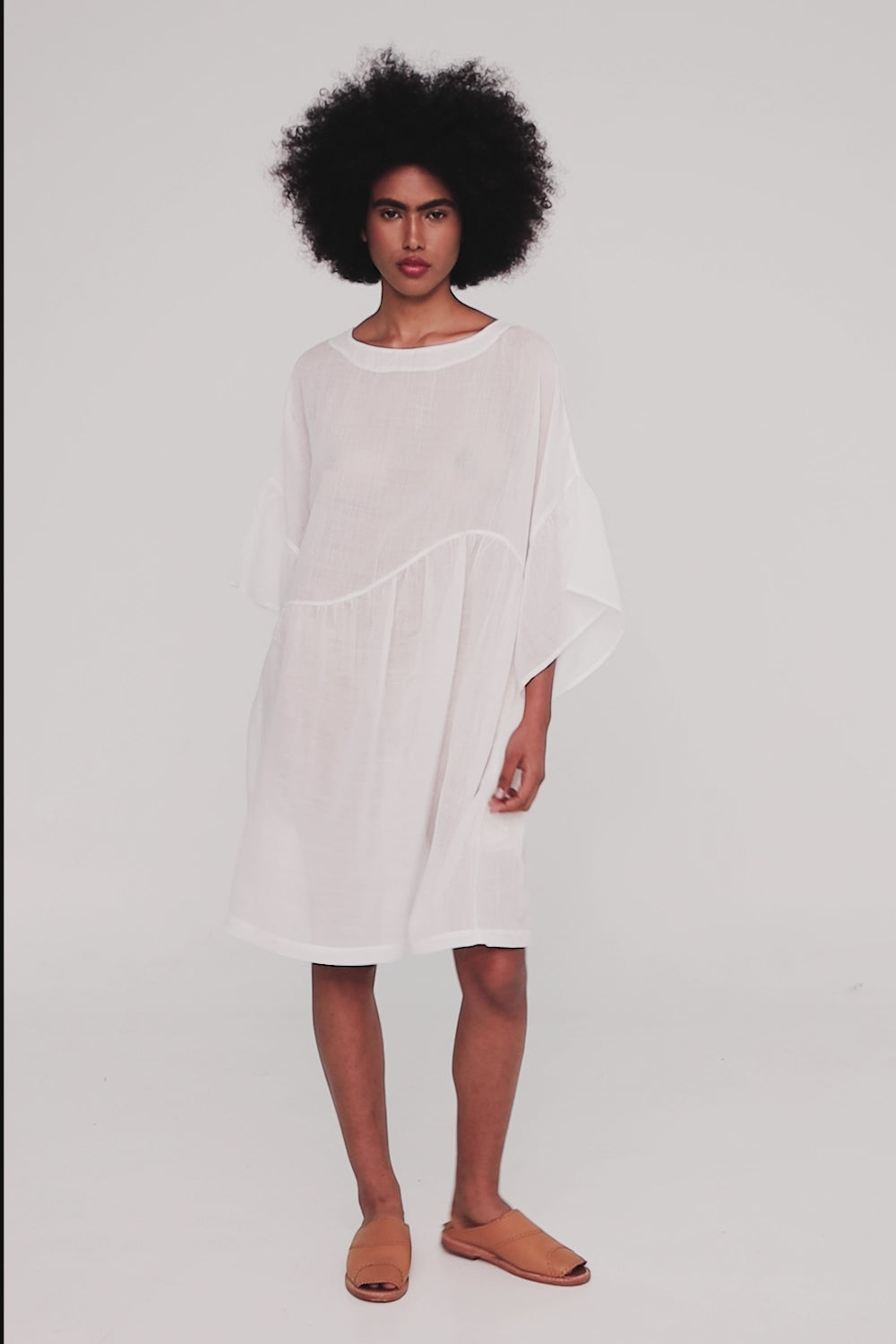 Vestido em organdi de rami, tecido com leve transparência. Decote canoa com fechamento em abertura "gota" na parte traseira e abotoamento em botão único de madrepérola. Mangas e saia franzidas que conferem movimento a peça em comprimento na altura do joelho.