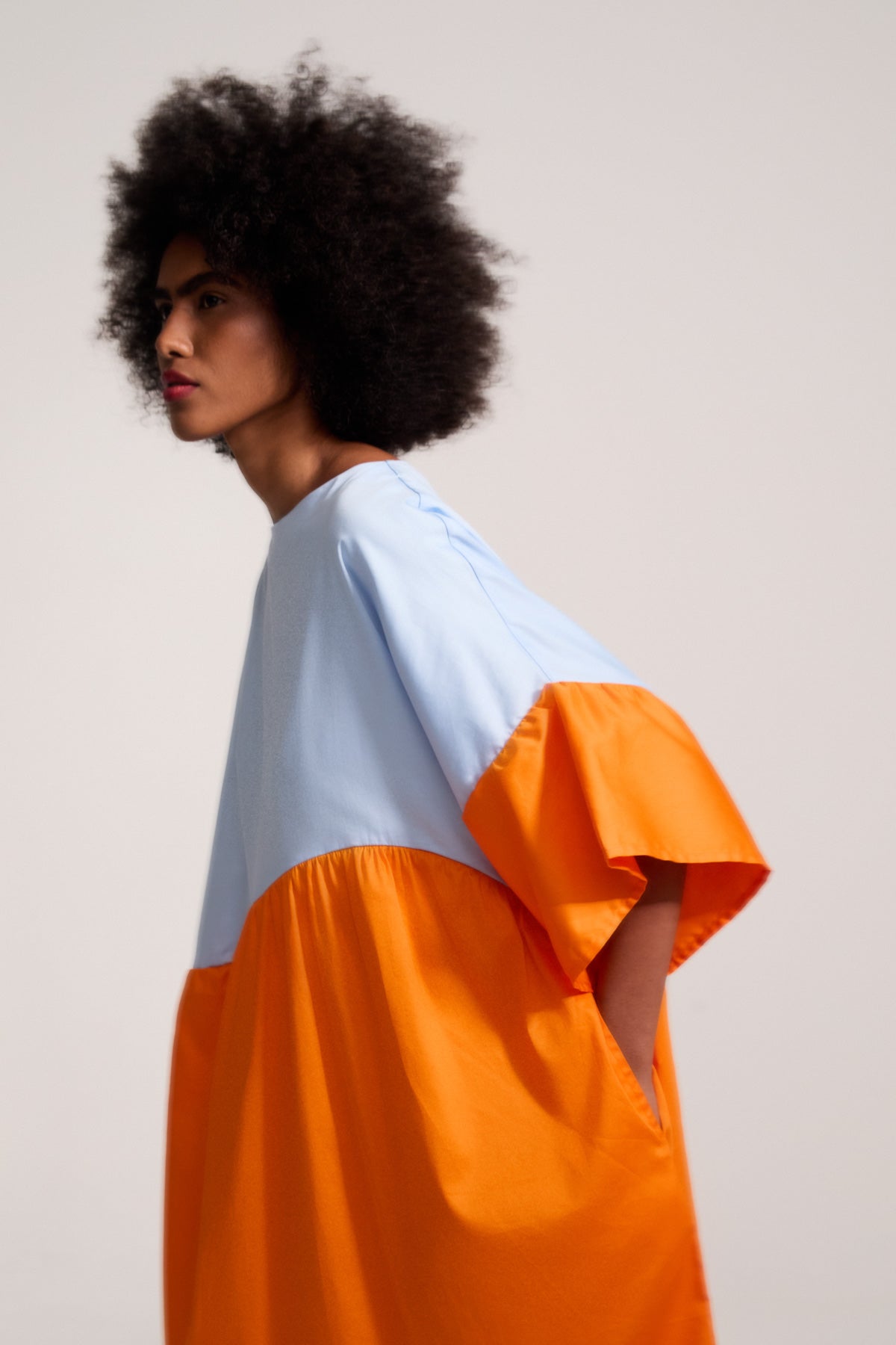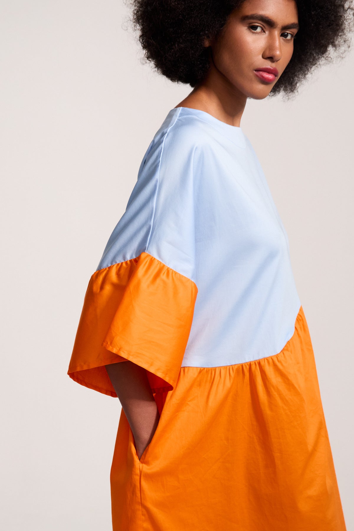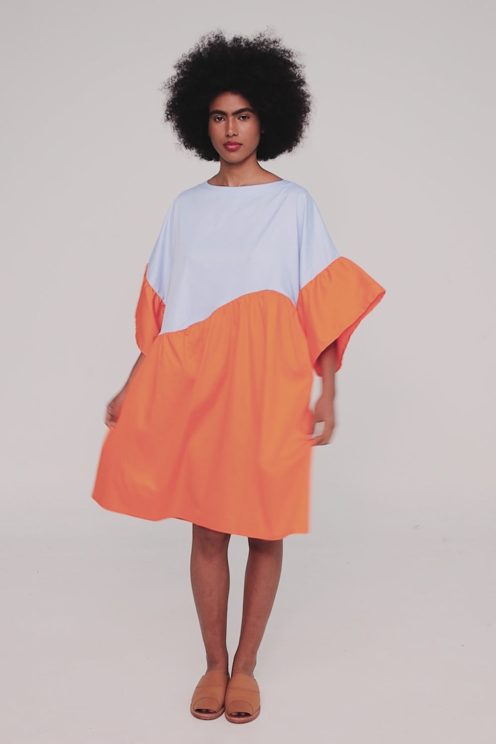 Vestido em tricoline de algodão premium com acabamento levemente acetinado. Decote canoa com fechamento em abertura "gota" na parte traseira e abotoamento em botão único de madrepérola. Mangas e saia franzidas que conferem movimento a peça em comprimento na altura do joelho.