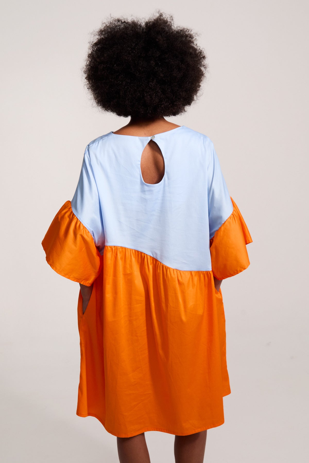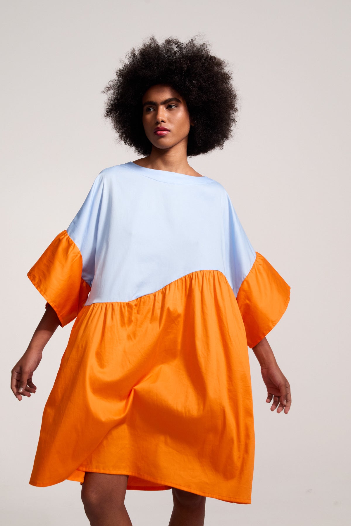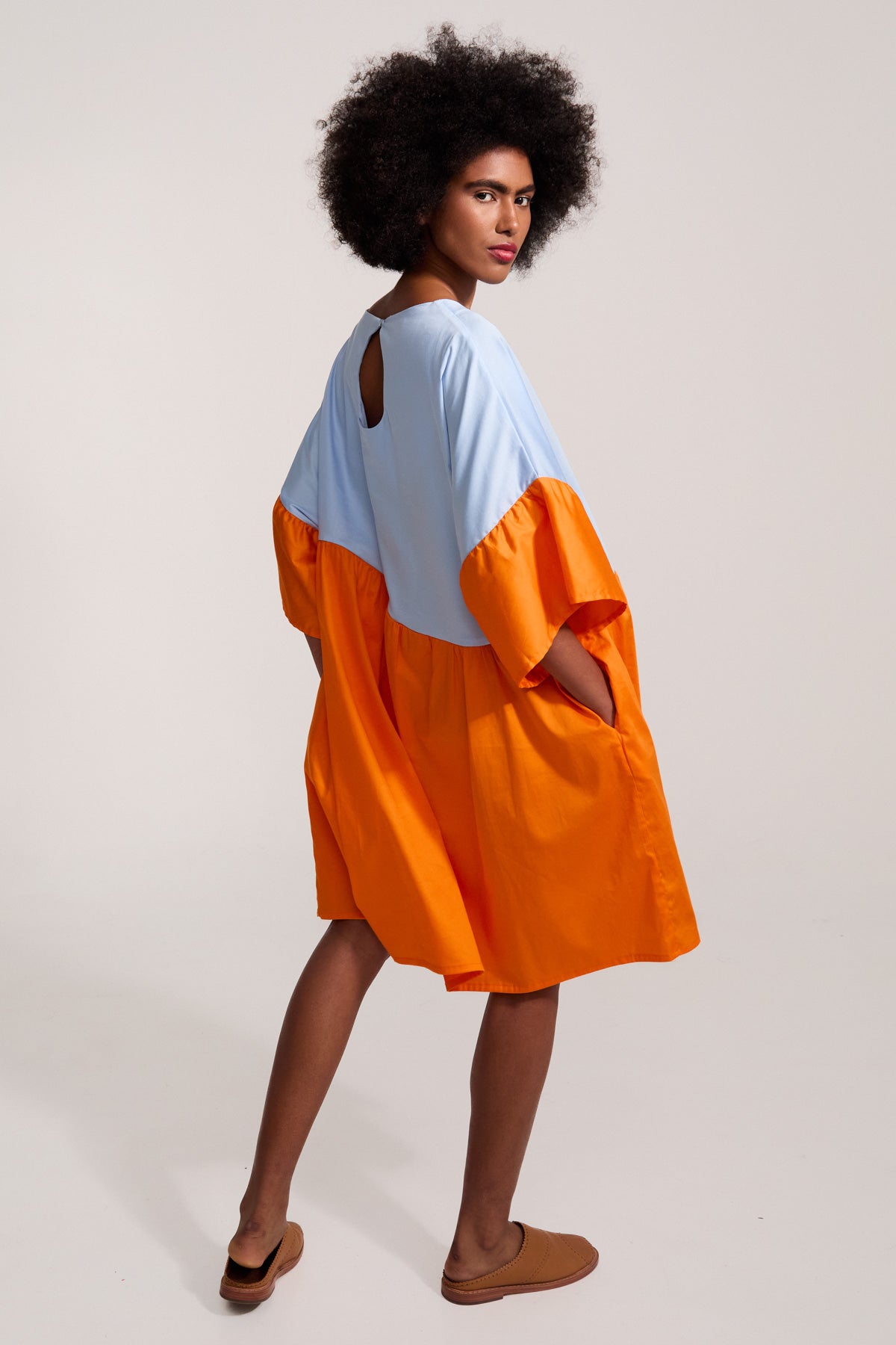 Vestido em tricoline de algodão premium com acabamento levemente acetinado. Decote canoa com fechamento em abertura "gota" na parte traseira e abotoamento em botão único de madrepérola. Mangas e saia franzidas que conferem movimento a peça em comprimento na altura do joelho.